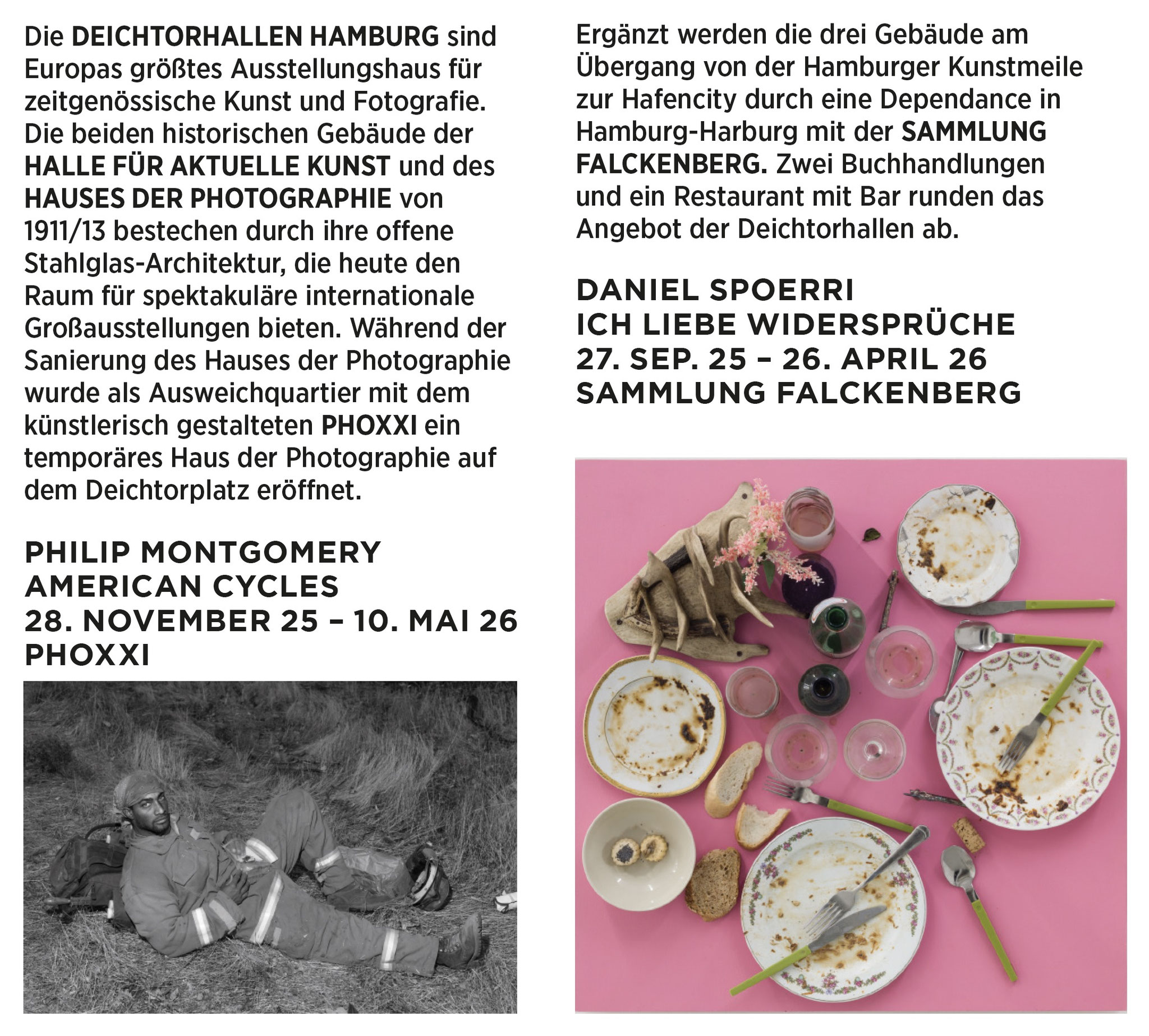 Die Deichtorhallen Hamburg sind eines der größten Ausstellungshäuser für zeitgenössische Kunst und Fotografie in Europa. Die beiden historischen Gebäude von 1911/13 bestechen durch ihre offene Stahlglasarchitektur und bieten heute Raum für spektakuläre internationale Großausstellungen. Seit 2011 werden die beiden Gebäude am Übergang von der Hamburger Kunstmeile zur Hafencity durch eine Dependance in Hamburg-Harburg mit der Sammlung Falckenberg ergänzt.
