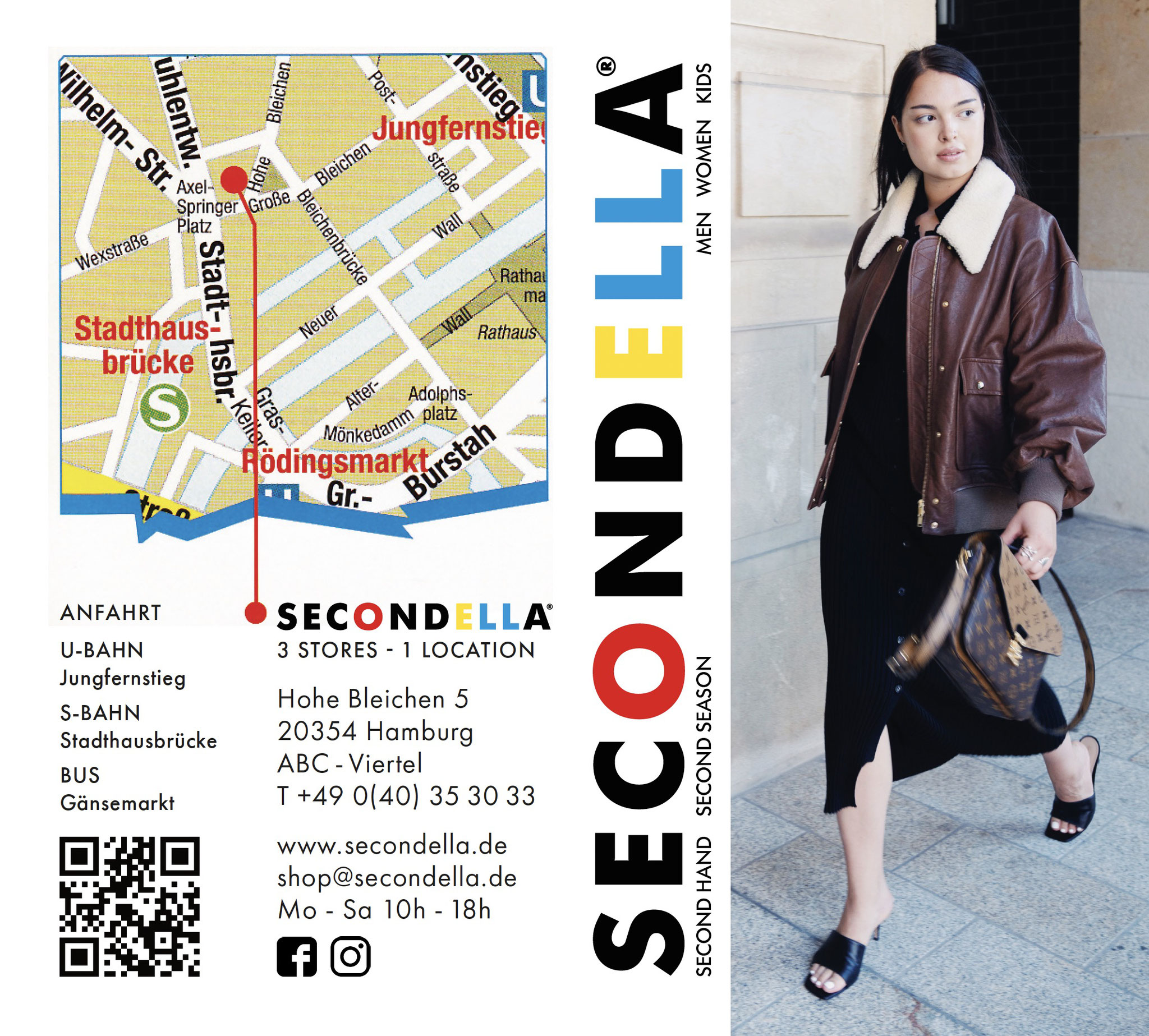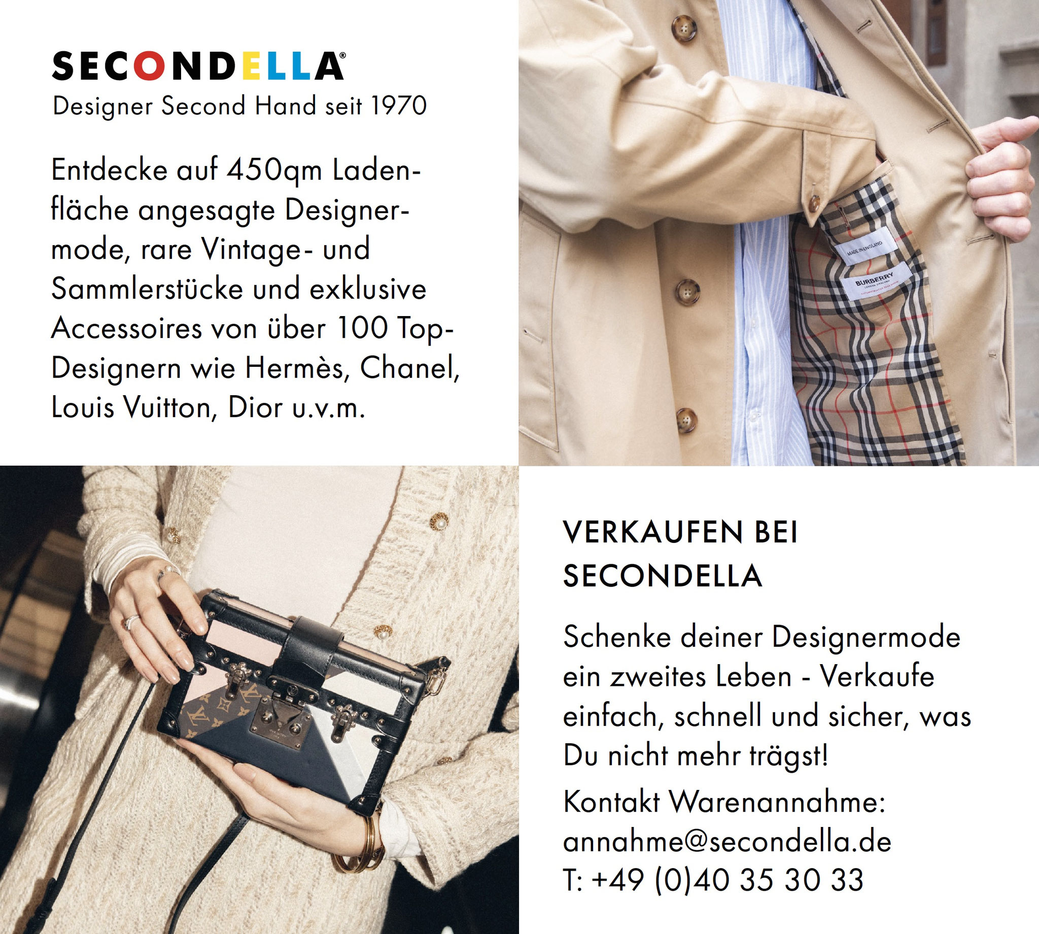 Seit 1970 lässt SECONDELLA Modeherzen höher schlagen. Ansässig im traditionsreichen Hamburger ABC-Viertel, umgeben von Designer-Flagship Stores und exklusiven Einzelhandelsgeschäften, finden Design-Enthusiasten auf 450qm Ladenfläche angesagte Designermode, rare Vintage- und Sammlerstücke und exklusive Accessoires von über 100 Top-Designern wie Hermès, Chanel und Louis Vuitton, bis hin zu angesagten Labels wie Isabel Marant, Céline oder Kenzo.