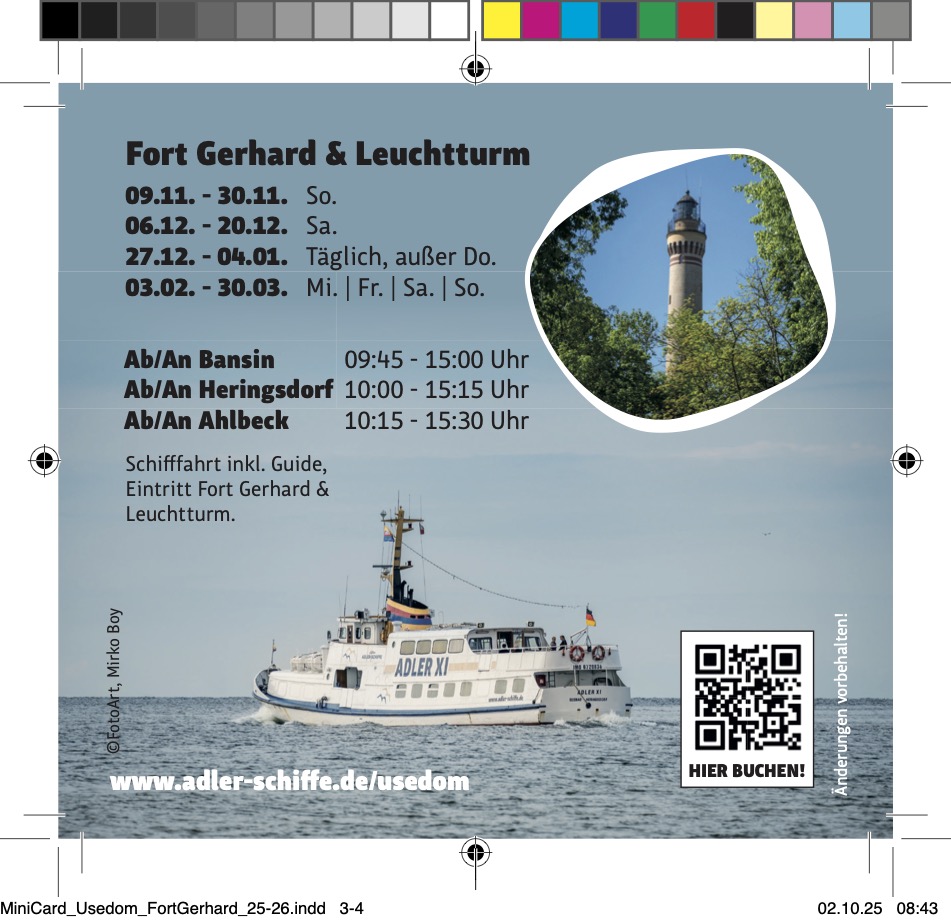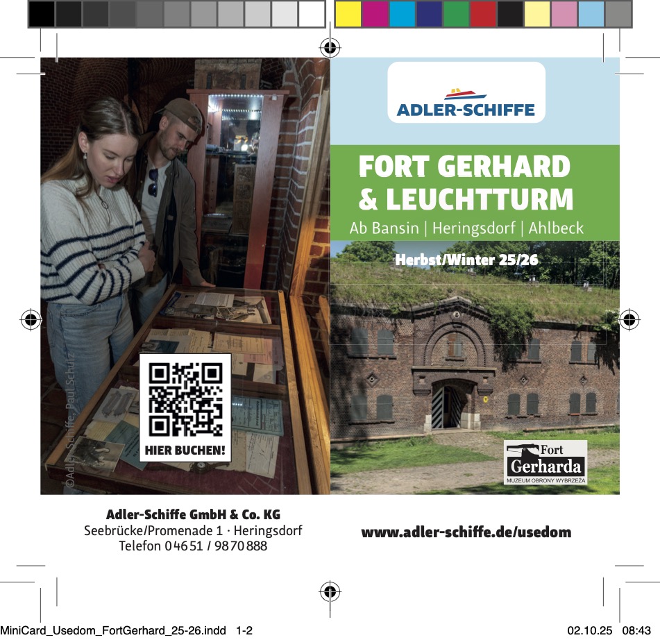 Mit der MS „Adler XI“ legen wir direkt unterhalb der Festung „Fort Gerhard“ an. Diese erkunden Sie in Begleitung eines deutschsprachigen Guides in preußischer Uniform. Während des Ausfluges können Sie die alte Festungsanlage Wollins erobern, verwunschene Orte entdecken und den höchsten Leuchtturm der Ostsee (64,8 m) erklimmen. Nachdem Sie die 308 Stufen überwunden haben, werden Sie mit einem sagenhaften Blick über die Ostsee belohnt. Eine unterhaltsame Geschichtsstunde im preußischen Stil.